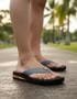 Outro destaque é o solado do chinelo, todo enfeitado com as ondas e as pedras portuguesas do calçadão de Copacabana feita em borracha vulcanizada e prensada, material de alta qualidade e excelente aderência (mesmo em pisos molhados). Quando usado na praia, o solado deixa uma marca bem bacana, mostrando que a marca é bem detalhista na fabricação de seus produtos. A bandeirinha do Brasil é um charme e mostra o orgulho da DuRio em ser uma marca brasileira.