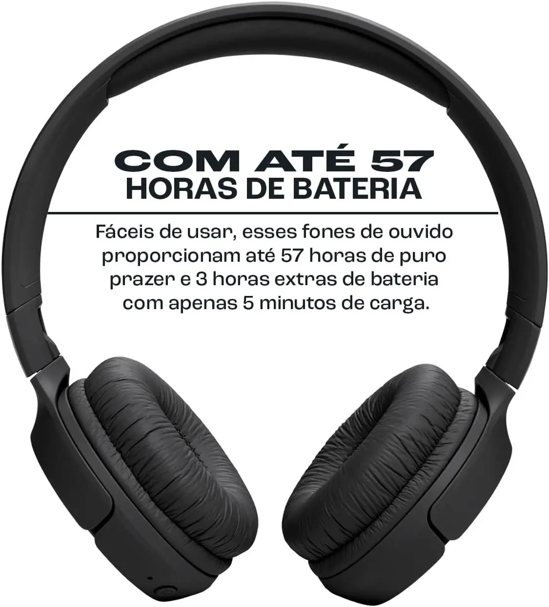 Um dos recursos de destaque do JBL Tune 520BT é sua impressionante duração de bateria. Com até 57 horas de reprodução com uma única carga, você pode aproveitar dias de audição sem precisar recarregar com frequência. Além disso, se estiver com pressa, o recurso de carga rápida oferece até 2 horas de reprodução com apenas 5 minutos de carga, garantindo que seus fones de ouvido estejam sempre prontos quando você estiver.